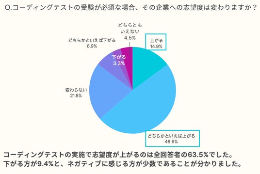 1. コーディングテストの実施は、志望度が「上がる」「どちらかといえば上がる」との回答が6割以上コーディングテストを実施することで候補者の意欲が上がることが分かりました。技術力が選考基準に入っていることはポジティブで、採用プロセスに対する納得感が高まると言えます。