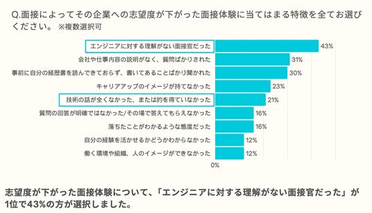 2. 4割以上が「エンジニアに対する理解がない面接官」は志望度が下がると回答面接でエンジニアへの理解がないと志望度が下がっています。技術の話がない場合も志望度が下がっていることから、例えば技術的な質問がなくコミュニケーション能力を過度に重視されるような面接は好まれないと推察します。