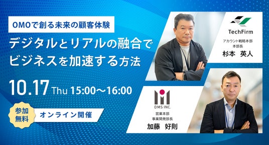 顧客企業と生活者のよい関係づくりをトータルサポートする株式会社ディーエムエス(本社:東京都千代田区、代表取締役社長:山本 克彦、東証スタンダード市場:証券コード9782、以下当社)は、クライアントの描く未来をテクノロジーで実現するテックファーム株式会社(本社:東京都新宿区、代表取締役社長:千原 信悟、以下テックファーム)と共催で、「OMOで創る未来の顧客体験 ~デジタルとリアルの融合でビジネスを加速する方法~」と題したセミナーをオンラインにて開催します。
