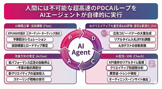 戦略策定から入札調整、クリエイティブの差し替えまで、AIエージェントが人間の代わりすべての実務プロセスを自律的に完結させます。