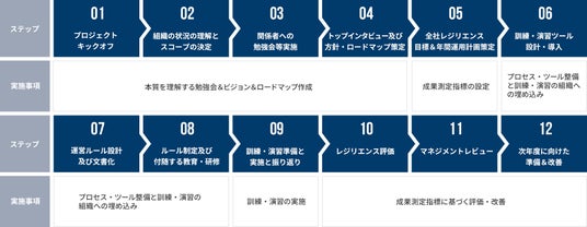 仕組み導入にあたっては、運営事務局に(難易度の高い知識・技術ではありませんが)基本的な力量が必要になります。お客様の力量に合わせて、事務局や主要関係者に対する基本的な「教育・研修」を提供します。また、ご要望に合わせて「訓練・研修」の実施や「レジリエンス評価」など、運営の機能の一部を当社にて実施することも可能です。
