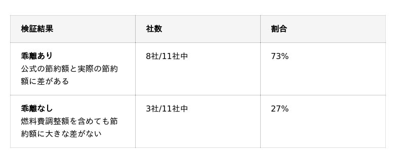 燃料費調整額を含めていない11社のうち、73%にあたる8社で公式の節約額と実際の節約額に乖離が確認されました。