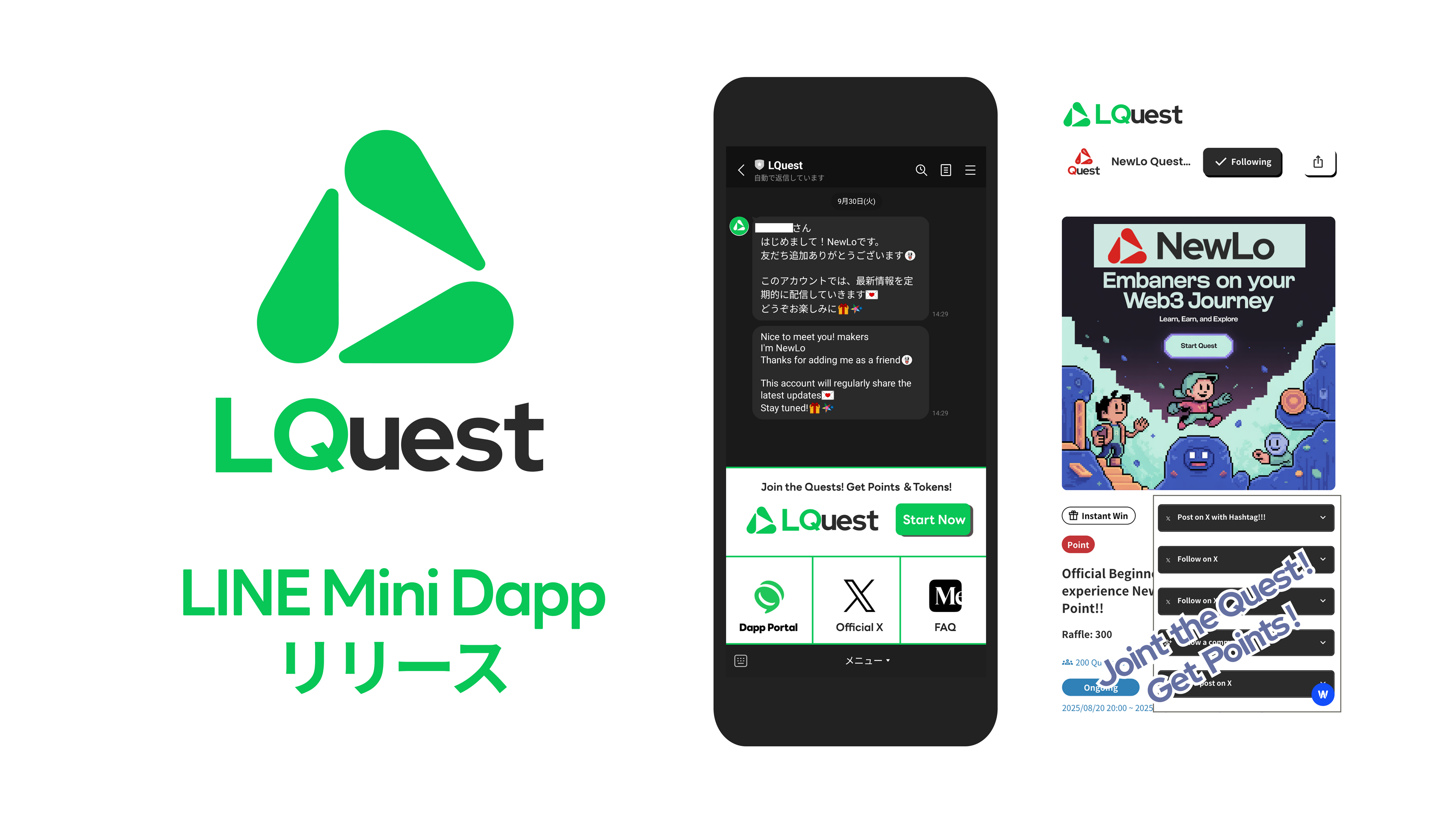 ブロックチェーン技術を活用した、あたらしいポイントマーケティングを進めるNewLo株式会社(本社:東京都渋谷区、代表取締役:前田英樹、以下「当社」)は、LINE Mini Dappのキャンペーンツール「LQuest」をリリースしました。LINEのメッセンジャーアプリ内で完結する手軽な体験を通じて、幅広い層にシームレスにトークン活用型のマーケティングプログラムへと導くことを目指しています。