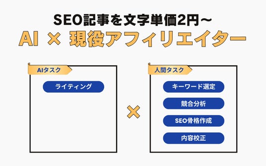 現役アフィリエイターとAIが融合した格安の記事制作代行サービスでして、文字単価2円~という格安料金で、「キーワード選定、競合調査、骨格作成、記事制作」までを一気通貫で対応いたします。