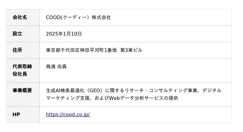 COOD株式会社(本社:東京都千代田区、代表取締役:鳥濱 尚真、以下 COOD)は、