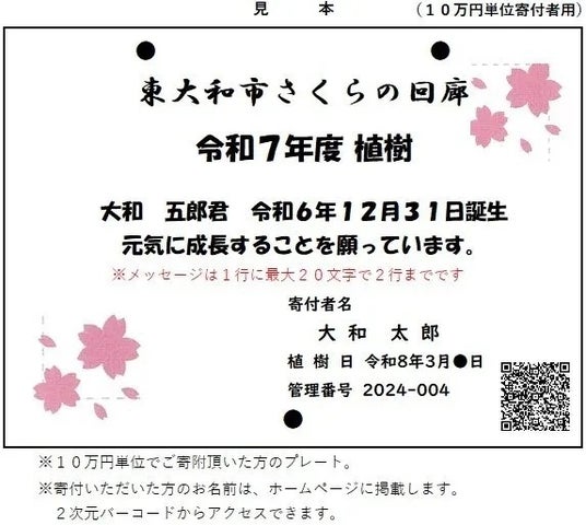 植樹する桜には、10万円で寄附者の名前とメッセージが刻まれる「寄附者プレート」を設置します。