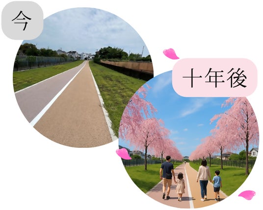 本プロジェクトでは、散策環境の充実と世代を超えた「思い出の場所」づくりとして「しだれ桜」を植樹し、未来の「桜の回廊」を創出します
