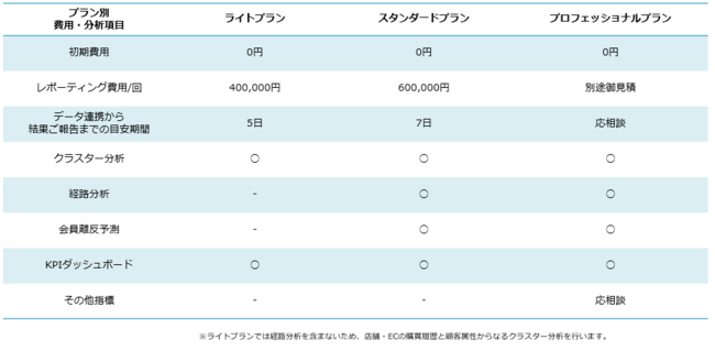 初期費用無料で分析内容に応じた3つのプランをご用意しております。プロフェッショナルプランは、クライアント企業様の売上向上に影響を与えうる各種データを取得し、分析に反映することができます。
