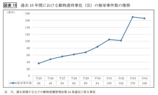 警察庁が発表している過去10年の動物虐待の検挙数です。右肩上がりの要因は法律改正、警察の積極的な検挙など要因は複数ありますので単純に”増えている”という認識よりは、”