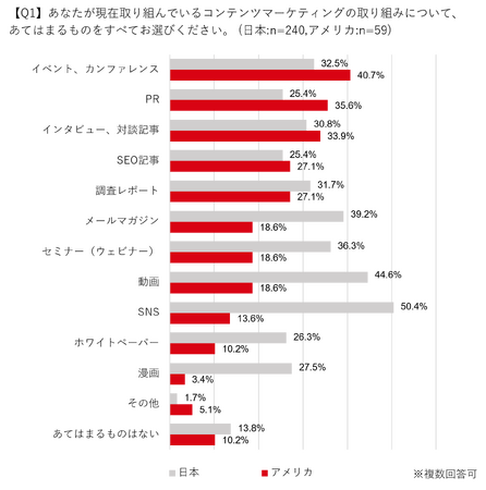 日本はデジタル中心の施策に重点を置いている一方、アメリカではリアルイベントやPRといった、顧客との関係性構築やブランディングに関連性が高い施策が上位となりました。