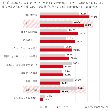 一方アメリカでは、最多回答が「高い専門性」で41.5%、続いて「低いコスト」36.6%、「自社への理解度」31.7%となりました。日本で2位にランクインした「柔軟な対応」は、アメリカでは最下位という結果に。
