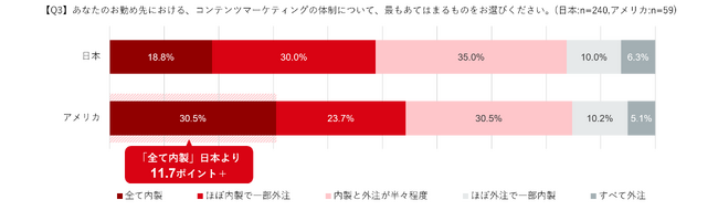 アメリカでは、「全て内製」と「内製と外注が半々程度」がともに30.5%で最多回答でしたが、「全て内製」という回答が日本と比べて11.7ポイント高い結果になりました。