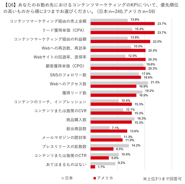 これに対しアメリカの回答トップ3は、「コンテンツマーケティング経由の売上金額」(23.7%、日本より9.9ポイント+)と「リード獲得単価(CPA)」(23.7%、日本より8.3ポイント+)、「コンテンツマーケティング経由の利益額」(22.0%、日本より8.2ポイント+)という結果になりました。