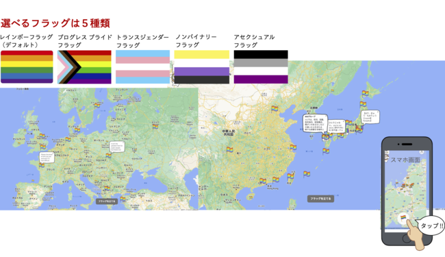 ご自身の住んでいる場所にマーカーを合わせてフラッグを立てるだけという手軽さもRainbow Mappingの魅力の一つ。(フラッグは自動で50mずれるように設定されていますので、実際の居場所が表示されることはありません。)また、写真やメッセージを添えることも可能ですので、LGBTフレンドリーな企業やショップと当事者を繋ぐパイプラインとしてもご活用いただけるサービスです。