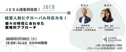 2000年の創業以来、グローバル&自立型人材の育成を追求し続けているグローバル・エデュケーションアンドトレーニング・コンサルタンツ株式会社(本社:東京都渋谷区代官山町、代表取締役:福田聡子、以下グローバル・エデュケーション)は、株式会社JERA(本社:東京都中央区日本橋、代表取締役会長:可児 行夫、以下JERA)よりHR統括部 人財開発部長 海野 泰様をゲストに、「グローバルタレント育成」をテーマとした企業の人材育成ご担当者様向けの無料セミナーを開催します。