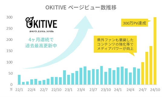 沖縄テレビ放送株式会社(本社:沖縄県那覇市、代表取締役社長:船越 龍二、以下「沖縄テレビ」)と株式会社アイリッジ(本社:東京都港区、代表取締役社長:小田 健太郎、東京証券取引所グロース:3917、以下「アイリッジ」)、アイリッジの連結子会社の株式会社Qoil(本社:東京都港区、代表取締役社長:山下 紘史、以下「Qoil」)は、3社が連携して運営する沖縄テレビのオウンドメディア「OKITIVE(オキティブ)」が2024年10月に月間ページビュー数300万PV(外部配信先PVを含む)を達成したことをお知らせします。