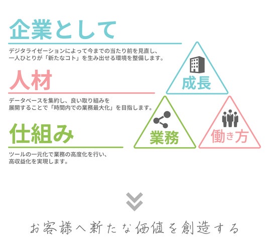 フジヤが推進するDXは、単なるデジタル技術の導入ではなく、【働き方】・【業務】・【成長】の3つの観点から組織全体の変革を目指すものです。DXを通じて、社員の創造性と生産性を高め、効率的な業務プロセスを構築し、持続的成長を実現します。また、デジタル技術を活用してお客様に新たな価値を創造することで、より豊かな社会の実現に貢献していきます。