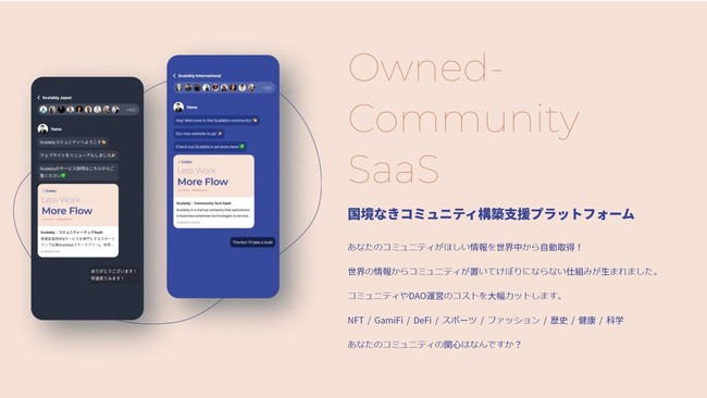 ■Scalably株式会社についてScalably株式会社(スケーラブリー)は、「コミュニティ=好きから始まる社会」を実現するために、企業だけではなく、その関連企業までもを含むエコシステムの情報を、届けたい人々に伝え続けるための自動化プラットフォーム「Ecomedia」を開発しているコミュニティテック企業です。情報技術を駆使し、国際的なコミュニティ形成と運営を実現。コミュニティと企業が出会い、つながる世界を実現します。