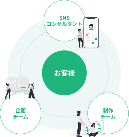 デザイナー、動画編集者、ライター、インフルエンサーなど、各分野のプロがチームとなって、お客様のアカウントを運用します。各々の強みを存分に発揮し、かけ合わせることで、常にクオリティの高い投稿を再現する環境が整っています。