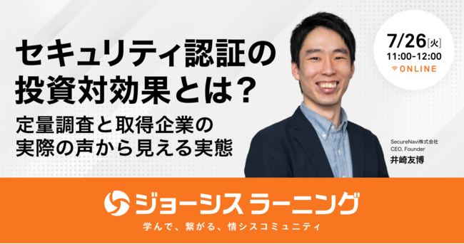 今回の「ジョーシス ラーニング」では、日本初のISMSオートメーションツール「SecureNavi」を提供するSecureNavi株式会社 代表取締役CEO 井崎智博様をお招きして、面倒なISMSなどのセキュリティ認証の投資対効果や、取得することによる事業上の意味についてお話していただきます。