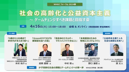 会社の未来を牽引する人材創出のための会員制フォーラム「World Healthcare Game Changers Forum(WHGC)」は、4月16日(火) 15:00~18:00に「社会の高齢化と公益資本主義 ~ ゲームチェンジすべき課題と目指す姿」をテーマに、WHGCフォーラム2024春を開催いたします。