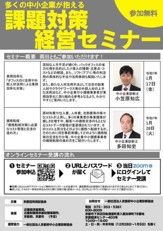 京都信用保証協会 京都信用保証協会と(一社)京都府中小企業診断協会が連携し、京都府下の中小企業者を対象にオンラインセミナーを開催いたします。同セミナーでは、中小企業者等の限られた経営資源をより効果的に活用し、「業務効率化」「価格転嫁」を図るための知識・機会を提供することを目的とし、本分野に精通した中小企業診断士が講演をいたします!