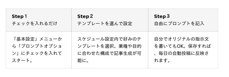 今回の「プロンプト設定オプション」では、この指示を誰でも簡単に入力・管理できるようになり、従来のAI自動生成記事よりもはるかに自然でオリジナル性の高い記事作成が可能になりました。