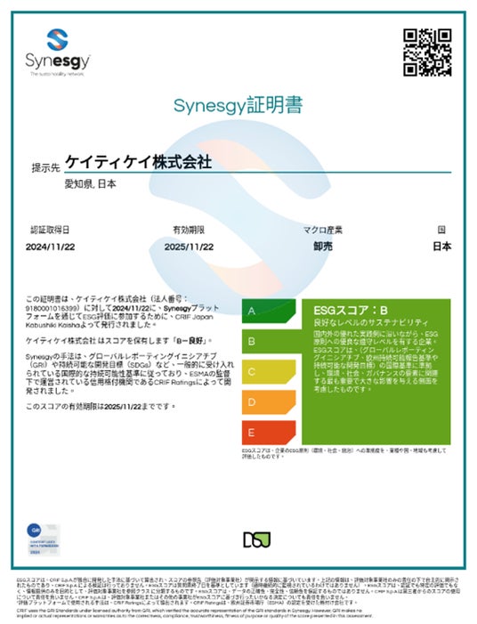 CRIF S.p.A(イタリア ボローニャ、会長兼CEO カルロ・ゲラルディ)の日本法人であるCRIF Japan株式会社(東京都千代田区、代表取締役 ビンチェンツォ・レスタ)は、同社が提供するESG評価サービス「Synesgy」において、ケイティケイ株式会社(愛知県名古屋市、代表取締役社長 青山英生、以下「ケイティケイ」)が「B」評価を取得したことを発表しました。今回の評価は、Synesgyが世界90カ国・約50万社に展開するESG評価プラットフォームの中で、上位約15%に該当するものです。