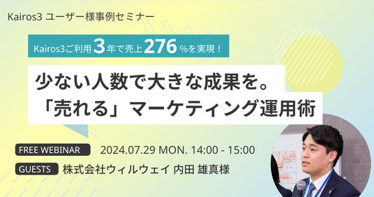 今回は、経営者向けコミュニティ「100年塾」を運営する株式会社ウィルウェイさまにご登壇いただきます。ウィルウェイさまは少人数で「Kairos3」を運用し、ご利用開始から3年で売上276%を達成されました。本セミナーでは、マーケティング活動全体の設計から、ChatGPTを活用した効率的な施策の進め方などをご紹介いただきます。