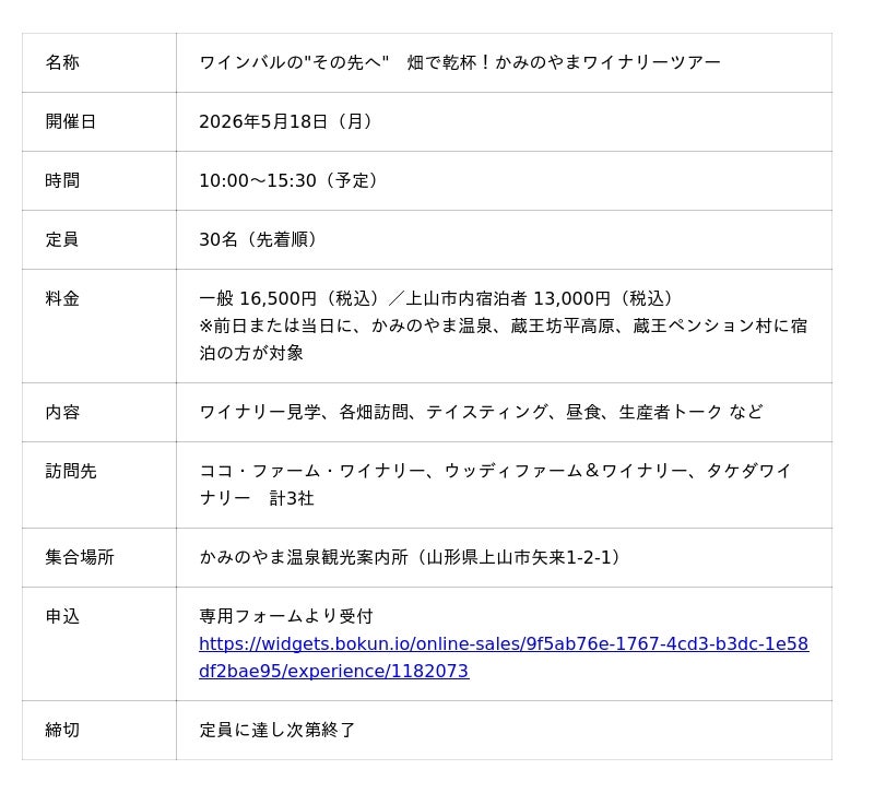 イベント参加を"日帰り"で終わらせない、滞在型体験へ本ツアーは、5月16日・17日の「山形ワインバル2026」に続けて、翌18日に開催。