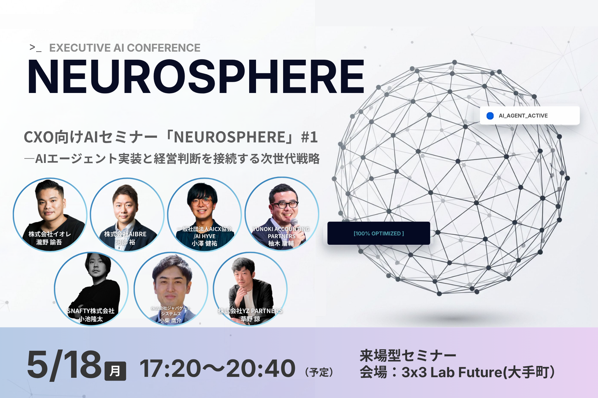 株式会社NEUROSPHEREは、2026年5月18日(月)、経営層・意思決定者を対象としたAI実装戦略カンファレンス「NEUROSPHERE」を大手町(3×3 Lab Future)にて開催いたします。