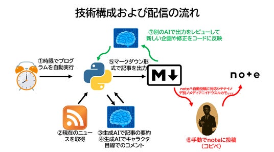 運営技術には、PythonによるRSSフィード解析/生成AIによる記事の草稿化/Markdown出力を活用した自動編集フローで組み合わされており、メディアプラットフォーム「note」に投稿されています。従来の物語的アプローチとデータ的精度を融合した設計が特徴です。技術構成は下図の通りです。