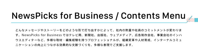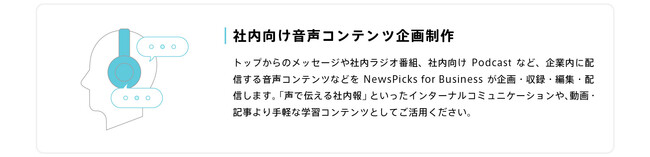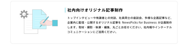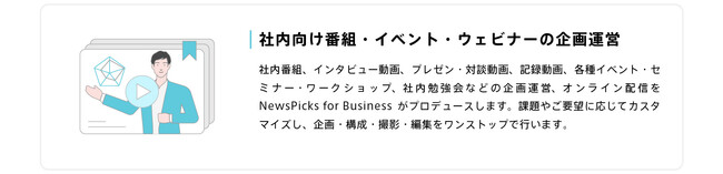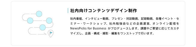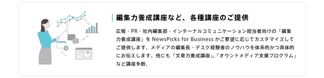 また、一部の顧客企業のみなさまのご要望に応える形で、NewsPicksの編集ノウハウを生かし、多様な記事コンテンツ・インフォグラフィックの企画制作や、社内向け番組、社内セミナー、社内イベントの企画・運営・制作を行ってまいりました。さらに、企業内編集部の養成講座や、ビジネスパーソンのための編集力・文章力養成講座など、スキルやノウハウの提供も行ってきました。