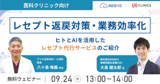 株式会社MEBAISは、株式会社メドレー様と共同で『レセプト返戻対策・業務効率化 ヒトとAIを活用したレセプト代行サービスのご紹介』セミナーを2024年9月24日(火)に開催致します。