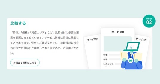 「特徴」「価格」「対応エリア」など、比較検討に必要な要素を簡潔にまとめています。サービス詳細は特徴に記載してありますので、併せてご確認ください!比較検討に役立つお役立ち資料もご用意しておりますので、ご活用ください。