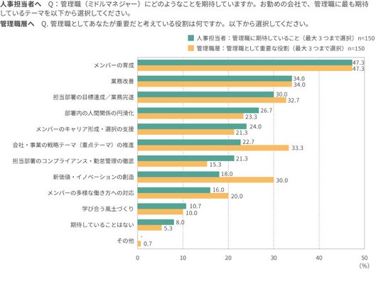 リクルートマネジメントソリューションズの調査によれば、企業側が「管理職に期待していること」や、管理職層が「管理職として重要な役割」として選択した項目のトップは双方ともに「メンバーの育成」です。ここから、管理職層は変化対応の必要性を強く感じながらも、自己のマネジメントや育成に悩みを抱え、試行錯誤する状況がうかがえます。