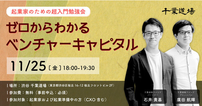 千葉道場ファンドは渋谷にある「千葉道場 渋谷コミュニティスペース」にて、起業家の皆様を対象にした参加費無料の勉強会「ゼロからわかるベンチャーキャピタル」を開催いたします。