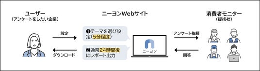 ニーヨンでは用意されたマーケティングリサーチのテーマを選ぶことで、アンケートの設計から消費者パネルへのアンケート配信、レポートの作成までが自動化されたリサーチパッケージを利用できます。Webサイト上で5分程度の簡単な設定をするだけで、通常24時間後にはPowerPointの結果レポートをダウンロードできます。