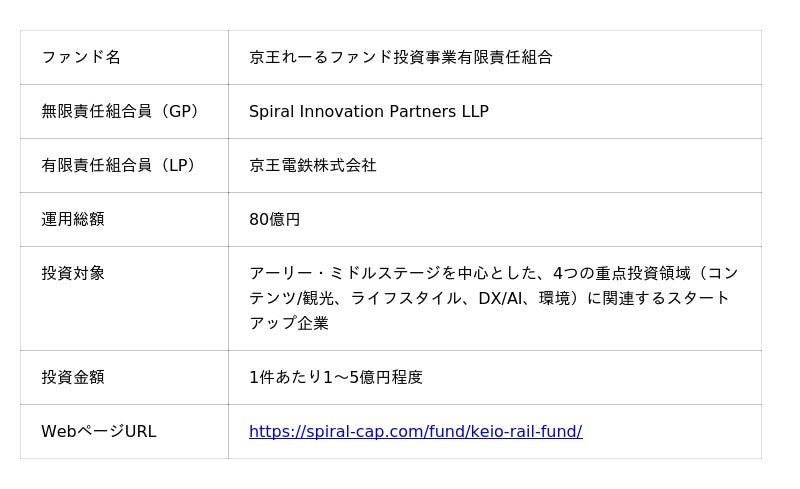 Spiral Innovation Partners株式会社(Spiral Capital株式会社〔本社:東京都港区、ジェネラルパートナー兼CEO 奥野 友和〕の子会社、以下「SIP」)は、傘下のSpiral Innovation Partners LLPを通じて、京王電鉄株式会社(本社:東京都多摩市、代表取締役社長 都村 智史、以下「京王電鉄」)と共同で、80億円規模のCVCファンド