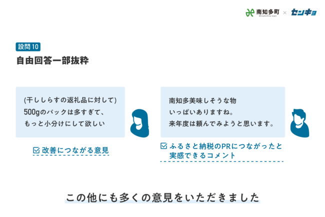 今回の事業では、東京都・愛知県に居るユーザー計約8500名にアンケート回答を頂きました。 また、約7割の方から自由回答での意見を頂き、返礼品に関して改善につながる大変貴重な意見を集めることが出来ました。