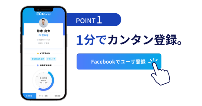 Facebookを用いて、カンタンにECのプロとして登録することができます。一度登録した情報は、専用画面からいつでも編集することができます。