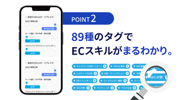 ECのプロは日本で唯一「ECに特化した複業人材マッチングサービス」を展開しています。EC事業ならではの、売上拡大や顧客獲得といった課題に対し、89種のスキルタグに細分化されたECのプロ登録者が、初期費用0円・最短2日で見つかるサービスです。