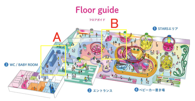 広告掲出場所は、下記のA(下駄箱入口)とB(施設中央遊具におけるゲームコーナー)