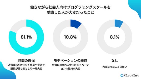 働きながらプログラミングスクールを受講した人の内、81.1%が時間の確保が大変だったと回答