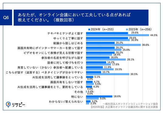 Q6.あなたが、オンライン会議において工夫している点があれば教えてください。(複数回答)」(n=253)と質問したところ、