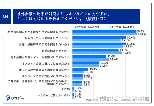 「Q4.社外会議の比率が対面よりもオンラインの方が多い、もしくは同じ理由を教えてください。(複数回答)」(n=172)と質問したところ、