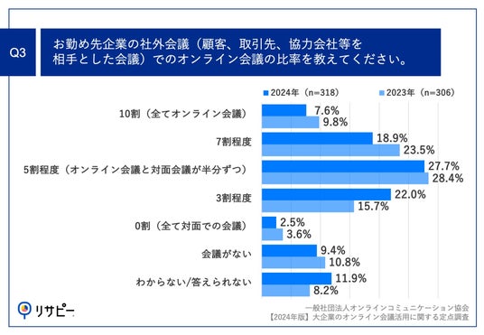 「7割程度」が18.9%、「5割程度(オンライン会議と対面会議が半分ずつ)」が27.7%という回答となりました。