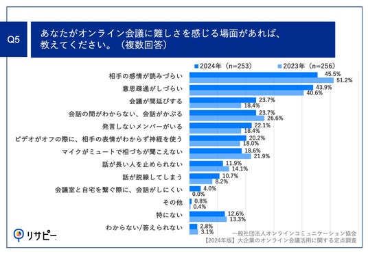 ■オンライン会議の難しさ、「会議が間延びする」23.7%、2023年から5.3ポイントアップ