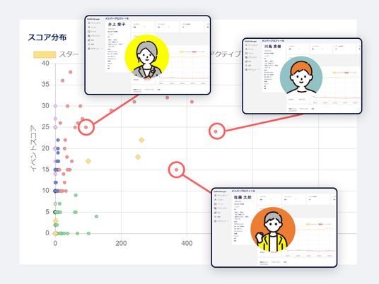 集約したデータをもとに、参加者のコミュニティでの活動をスコアリングし、さらに、スコアに応じて6つのクラスタに分類します。これにより参加者の参加度合いが定量化、相対化され、コミュニティ全体の活動傾向、活性度を把握することができます。また、データから、より熱量高く行動する参加者=「スター候補」を見つけ出します。