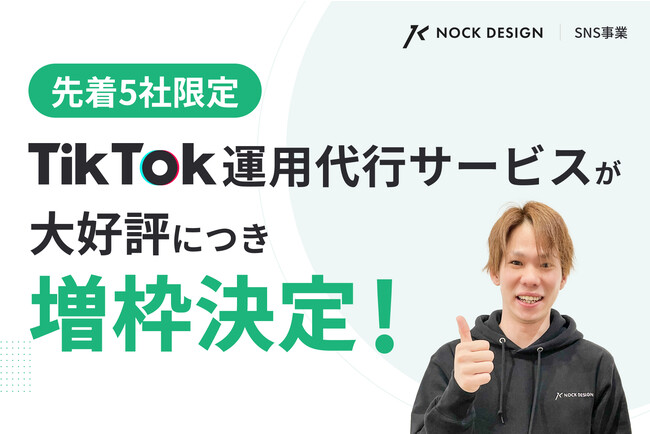 株式会社ノックデザイン(https://nock-design.com/)は、「資産性のある発信力を企業に」というテーマを掲げ、SNSをビジネス(https://sns.nock-design.com/)に活かしたいと考えている企業様の活動を全面的にサポートしています。その中でも今、非常に要望の多い「TikTok運用代行サービス」の半額キャンペーンを先着5社様限定で実施いたします。ぜひこの機会にお申し込みください。